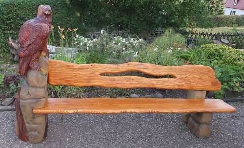 Seiten aus Tanne, Sitzfläche aus strukturierter Fichte. Die Verbindung zum rechten Seitenteil gewährleistet eine massive Schwalbenschwanzverzinkung.