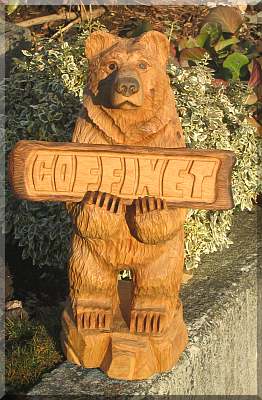 Dieser Bär steht in Frankreich. Das Schild in den Pranken zeigt den Namen der Besitzer.