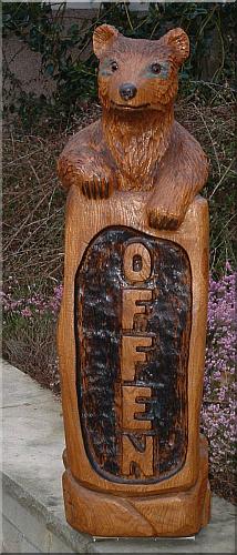 Der Bär weißt das typische "Kindchenschema" eines Jungbären auf: Die Schnauze geht noch relativ ansatzlos vom Kopf über, die Augen und Ohren sind verhältnismäßig groß, der Kopf ist deutlich vom Körper abgesetzt. Eiche, Höhe ca. 1m, mehrfach farbig geölt, mehrfach farblos geölt, 960,- EUR. Versandkosten ab 120,- €