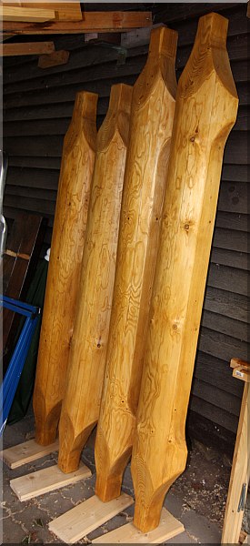 Gewünscht wurden vier Eck-Pfosten für ein Massivholzbett. Das Besondere und Aufwendige an diesen Pfosten ist das hohe Maß an Schleifarbeit. Da es sich hier ein Möbelstück handelt und die Fichte zum Ausfransen neigt, wurden die Pfosten komplett durchgeschliffen. Also nicht mal nur überschliffen, sondern jeder Bereich der Pfosten wurde bearbeitet, so das es keine sichtbaren Spuren der Motorsäge mehr gibt. Fichte Viertelholz, Höhe 70 - 120 cm, unbehandelt, Preis auf Anfrage Die Seitenteile, vom Kunden vorgefertigt - bereits gestrichen