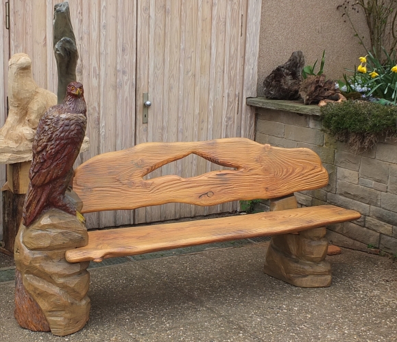Seiten aus Eiche, Sitzfläche aus strukturierter Fichte. Die Verbindung zum rechten Seitenteil gewährleistet eine massive Schwalbenschwanzverzinkung.