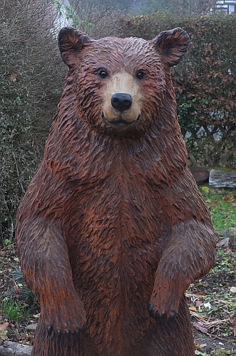Pappel halbiert, Höhe ca. 1,6 m, grundiert, mehrfach farbig lasiert und geölt, 1880,- € Um einen Bär in dieser Größe aus geteiltem Holz zu fertigen, bedarf es eines großen Rohlings, der dann halbiert werden kann -